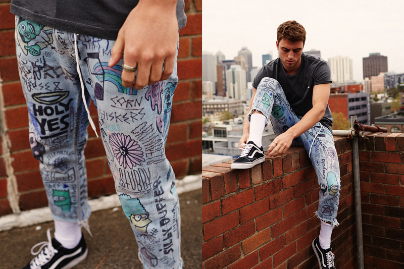 I just went wild with some posca pens, house paint and permanent markers! I prefer customizing a lighter denim as the markers and poscas show up really well, then you can chuck them in the washing machine once you’re done to give ‘em that sexy faded look. Anybody with arms can customize their own pair, my tip for you crafty kids is to just start scribbling and have fun with it. The more mistakes you make the better I say!